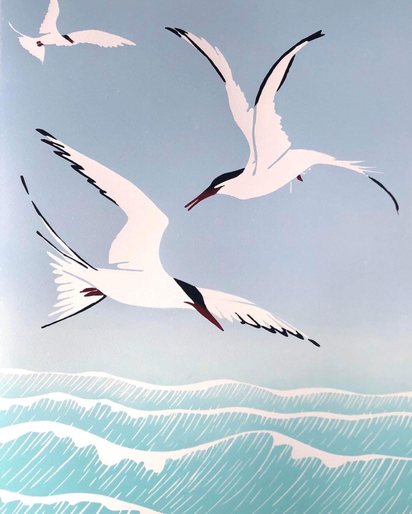 The second print is entitled “Peace! Be still”. The colour linocut print takes its name from Mark 4: 39, while the imagery captures the seabirds which may have met Margaret on her arrival in Scotland. This is a limited edition of 10 prints. Princess Anne has number 2 in the edition.